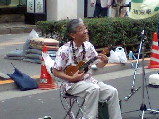 そう、shu-sanのヘブンアーティスト演奏を聴きに行くためだ! こどもの日ということで、家族総出で見に行くことに。 ちなみにリトルイズは、銀座は初めて。 shu-sanと会うのも初めてだ。 当日、出発直前まで、ベビーカーにするかおんぶ紐にするか議論したが、 結局ベビーカーで、銀座。 3時からshu-sanの演奏はスタート。 銀座には2時半に着く。 お昼は銀座、という約束だったので、適当なイタメシ屋に入る。 演奏場所への移動時間を考えると、20分しかない。 ・・・。 20分後。 前菜とスープしか食べていない・・・。 気持ちはもう店を出たいが、銀座に滅多に来ない嫁のために 我慢。 しかしリトルイズは我慢の限界のようで、途中で泣き出す。 それなりのイタメシ屋で、赤子を抱っこしてあやす、じゅごんと嫁。 結局メインディッシュを食べたら、3時半を過ぎていた。 4時からの演奏のため、慌ててイタメシ屋を出て、会場へ向かう。 しばらく歩くと、さらに先の通りからウクレレ、それもshu-sanの 音が聞こえる。 「ウクレレの音がしてきたね」 嫁も分かったようだ。 音の方向を見てみると、 shu-san、徹夜明けかな? ずいぶん目がはれぼったい・・、って別のパフォーマンスか。 ![]() さらに先に目をこらすと、 いたいた、shu-sanだ! やっぱり笑顔がいいなぁ。 出稽古の ![]() リトルイズも、胎教から聞いているだけあって嬉しそうだ。 嫁もいつものわしの演奏と違って、感動している。 感極まって一言。 「やっぱり本物は違うね」 わしの演奏は偽物かいっ! というつっこみは置いておいて、ほんに生演奏はええのぅ。 shu-sanもノリノリで、楽しそうだ。 選曲といい、MCといい、練られた構成で、ほんとにあっという間の30分。 楽しかったのぅ。 その後、NUAな方々と銀座で打ち上げ。 皆さまに、リトルイズと奥玉をご紹介。 嫁にもウクレレなか~まを紹介しておきたかったので、ほんによい機会 でした♪ それから、さらにウクレレ談義で盛り上がりっぱなし! 嫁も、かようなすてきな紳士・淑女とウクレレで盛り上がっていると 知って、すこしは理解が深まったようだ。 ![]() 後半、リトルイズがぐずりはじめたので、ちょっと早めに退席。 嫁のウクレレイメージをさらにアップするため、shu-sanと帰りの京王線で 洗脳したかったが、残念だ。(^_^; ちょっと満員電車は難しそうだったので、ロマンスカーで帰宅と あいなった。 今年のGWは、ウクレレ三昧でほんに楽しかったのぅ ![]() 世はすべて、事もなし。 ![]()